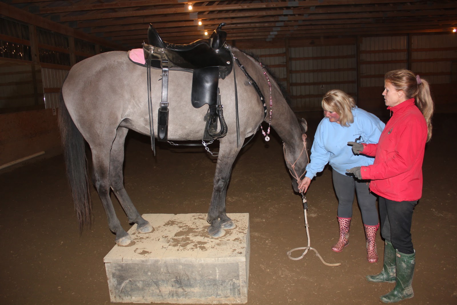 Now at this point I must share my Sassy girl's focused area of improvement ..... She loves to be close to her horse buddies!!! When I first became her human...she had a borderline obsession so we have made progress!! She was perfectly content if she knew the rest of her buddies were in the stable and I have her full attention. But she would become quite agitated if say she saw them from the round pen going to the pasture...or if she were in her stall...she would circle and call. We worked thru it ......or so I thought. Then last night....after well over a half hour of her just standing on the box....with none of us near her...Bucky passed by. Bucky is a lesson horse....and Sassy LIKES him!!! Off the box....snorting...with tail up and to the side (yes she is in season) my Sassy girl went!!!